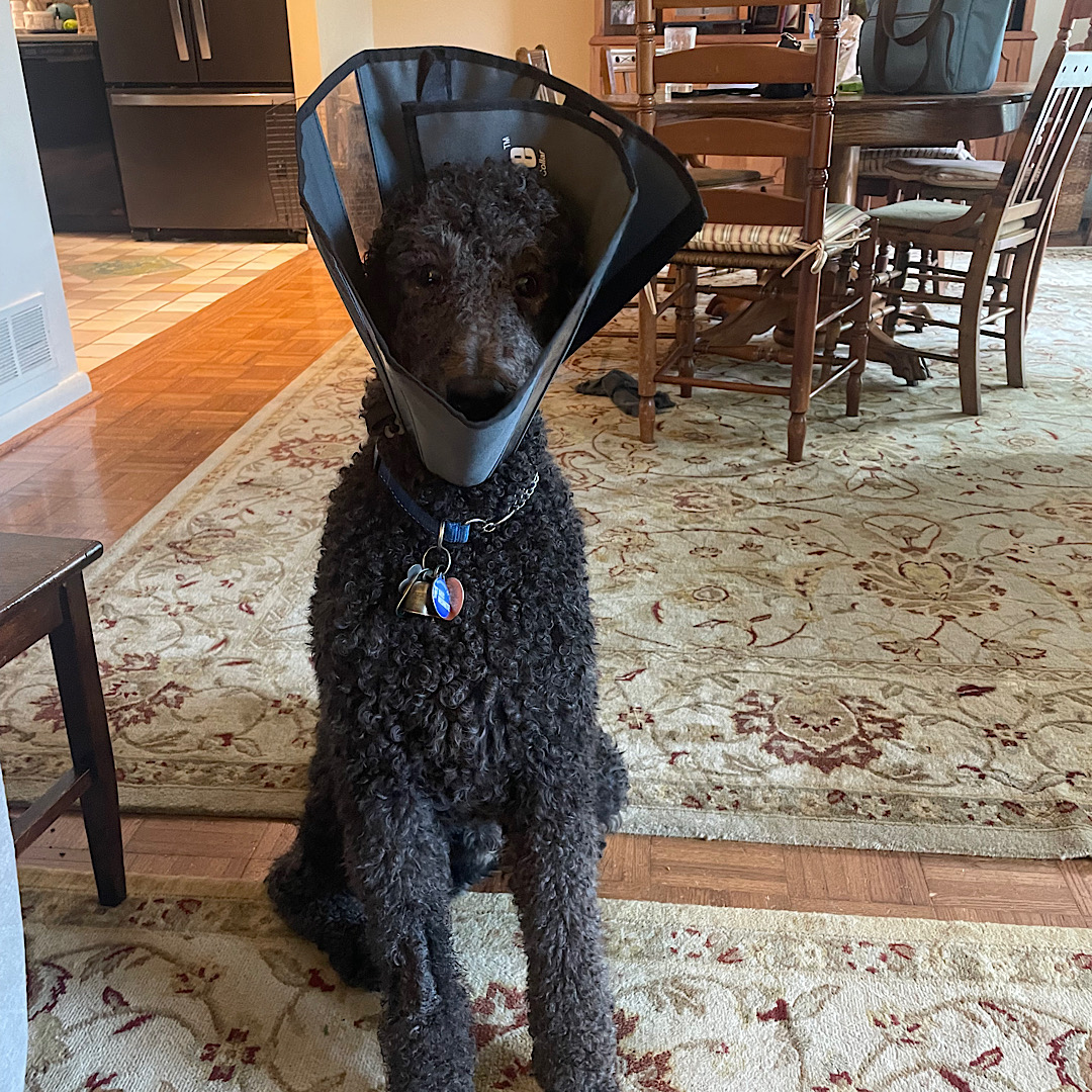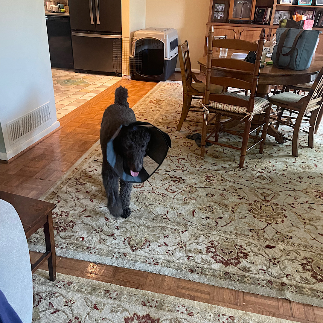 Somewhere during our travels, Sagan was bitten by something we think. He began licking his right front leg which has resulted in a small spot which is inflamed. He can’t leave it alone so he has been wearing that awful cone on his head to keep him from licking his leg. Being a poodle, he is able to defeat the cone when he is committed to the effort. We alternate between wrapping his leg and using the cone when we can be watchful every second. It is almost healed now so my hope is that he will forget about it.